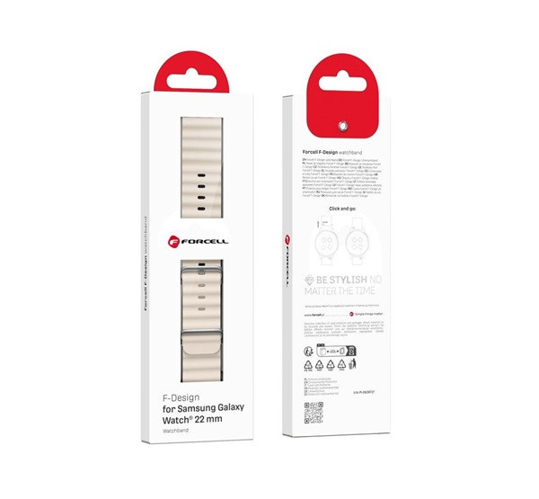 A Forcell F-Design szíjat nem csak klasszikus dizájnja, hanem sokoldalúsága is megkülönbözteti. Bármely 22 mm-es csatolási szélességű Samsung Watch órával viselhető. Továbbá minden típusú ruhatárhoz illik, a sportostól az elegánsig.