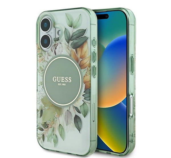 Guess IML Flower & Tonal Circle iPhone 16 Plus kemény hátlap tok, zöld GUHMP16MHFWBDCEN