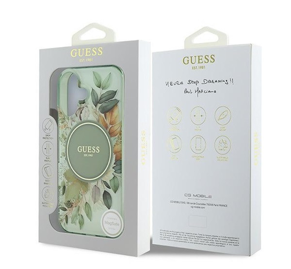 Ez az elegáns kollekció még a legigényesebb és legkifinomultabb ízlésűeknek is örömet szerez. A tok külső rétege finom virágmintával ragad magával, amelynek árnyalatai gyönyörűen harmonizálnak a tok színével, így alkotva egységes egészet. Középen egy arany MagSafe gyűrű található, amely tökéletesen kiemeli a GUESS logót zöld háttér előtt. Ez az egyedi kialakítás nemcsak eleganciát kölcsönöz, hanem funkcionalitást és védelmet is biztosít, így a tok stílusos kiegészítője az igényes felhasználóknak.