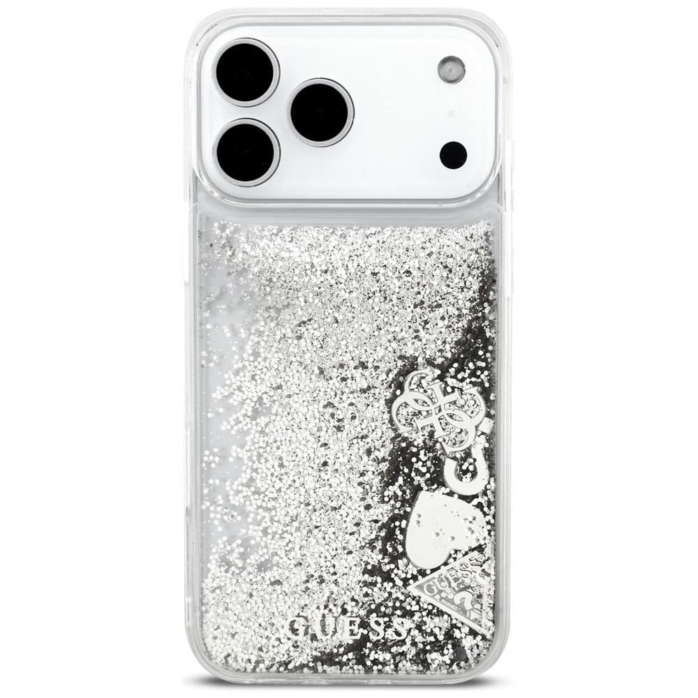 Guess Liquid Glitter Charms Apple iPhone 17 Pro Max csillámos hátlap tok kameravédő peremmel, ezüst
