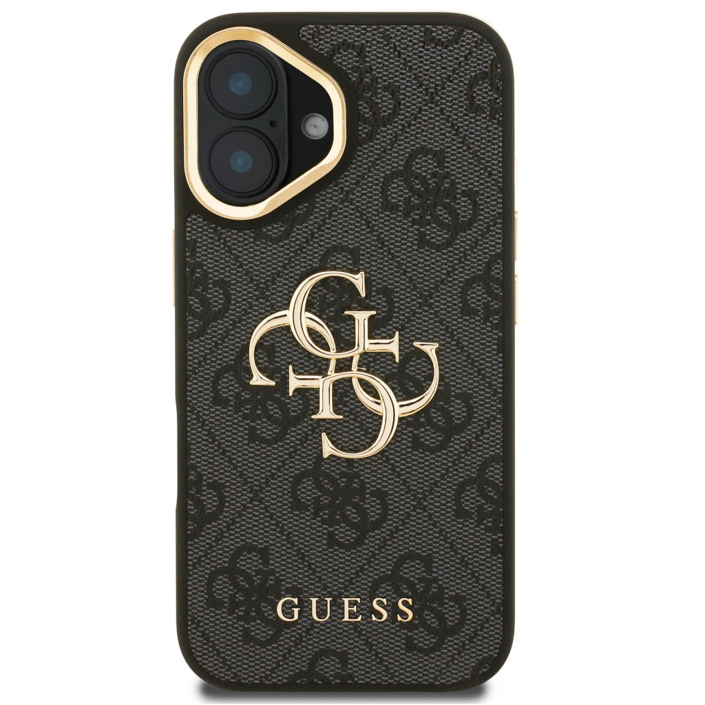 Guess PU 4G Metal Logo Apple iPhone 16 hátlap tok kitámasztható kamera peremmel, fekete-arany
