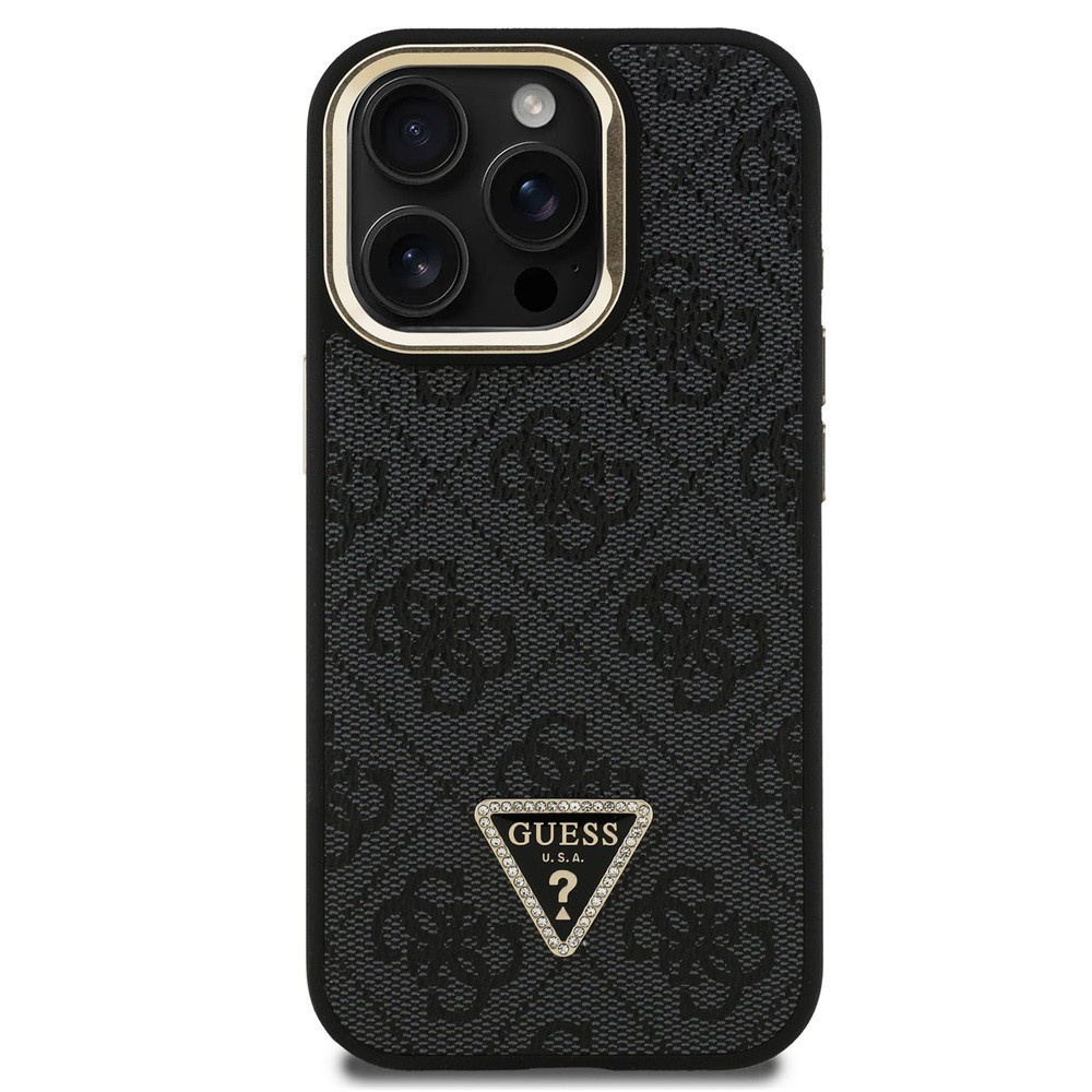 Guess PU 4G Strass Triangle Logo Apple iPhone 16 Pro MagSafe tok kitámasztható kamera peremmel, fekete-arany