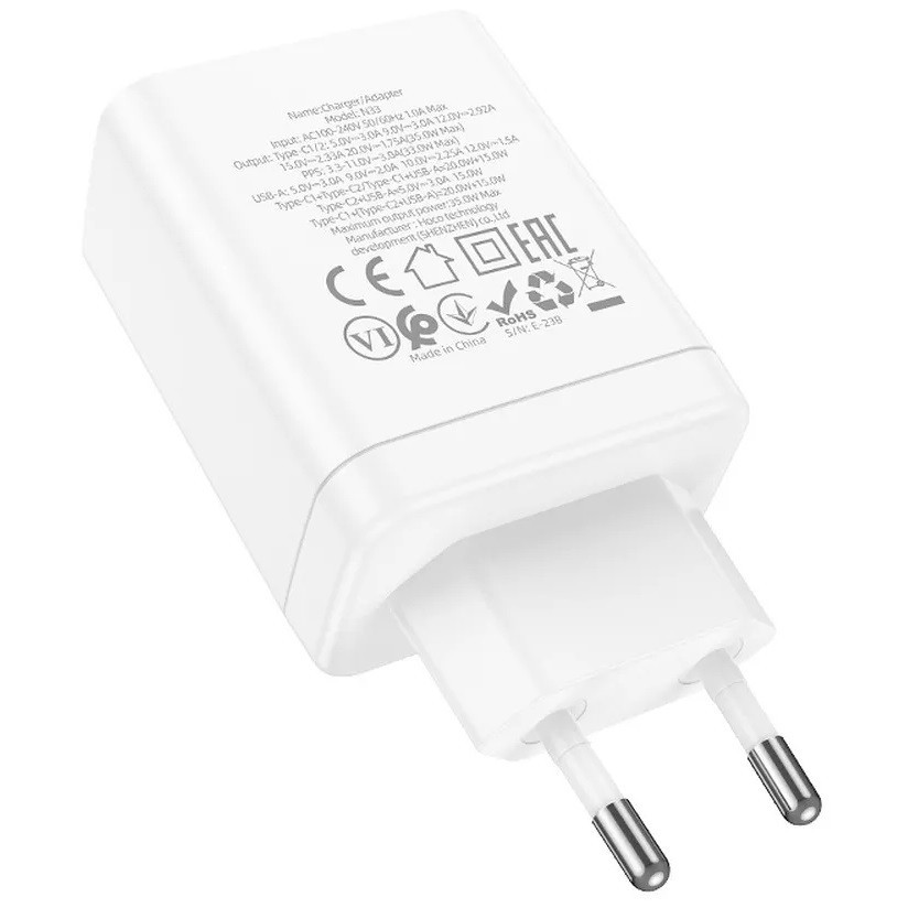 Hálózati töltő adapter, 35W, USB aljzat, 2 x USB Type-C aljzat, gyorstöltés, PD, QC 3.0, FCP, AFC, PPS, Hoco N33 Start, fehér