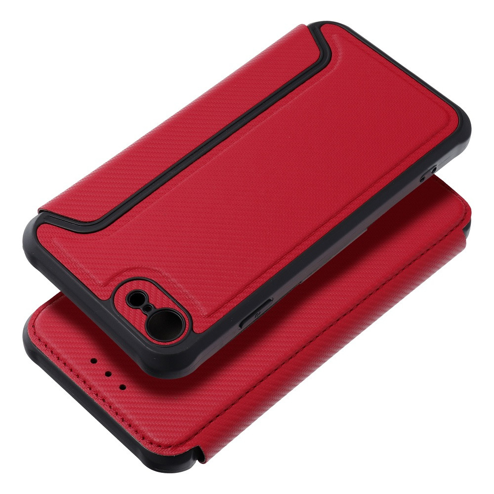 A karbon, sötét színű borító a sportautók dizájnjára utal, elegáns karaktert kölcsönözve a készüléknek. A puha belső anyag további védelmet nyújt a kijelző számára, míg a telefon tartó gumis részének méhsejt mintázata kiemeli az egész tok esztétikáját.