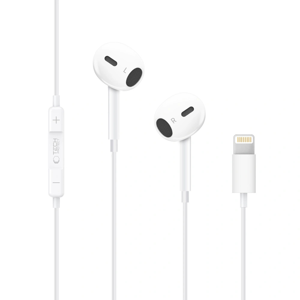 Tech-Protect UltraBoost Lightning vezetékes fülhallgató hangerőszabályzóval, mikrofonnal, fehér