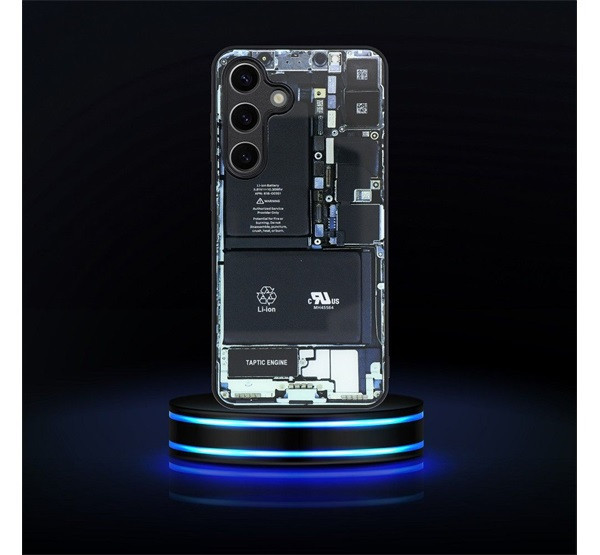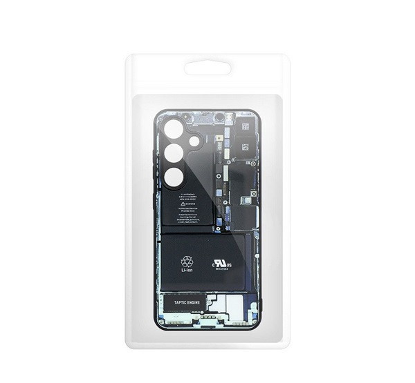 A hátlapot a telefon belsejét utánzó minta különbözteti meg . A tok szokatlan kialakítását a széleken és a belső oldalon elegáns matt fekete kivitel egészíti ki.