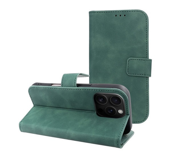 Tender Book iPhone 16 Pro flip/oldalra nyíló műbőr tok kártyatartó résszel, zöld