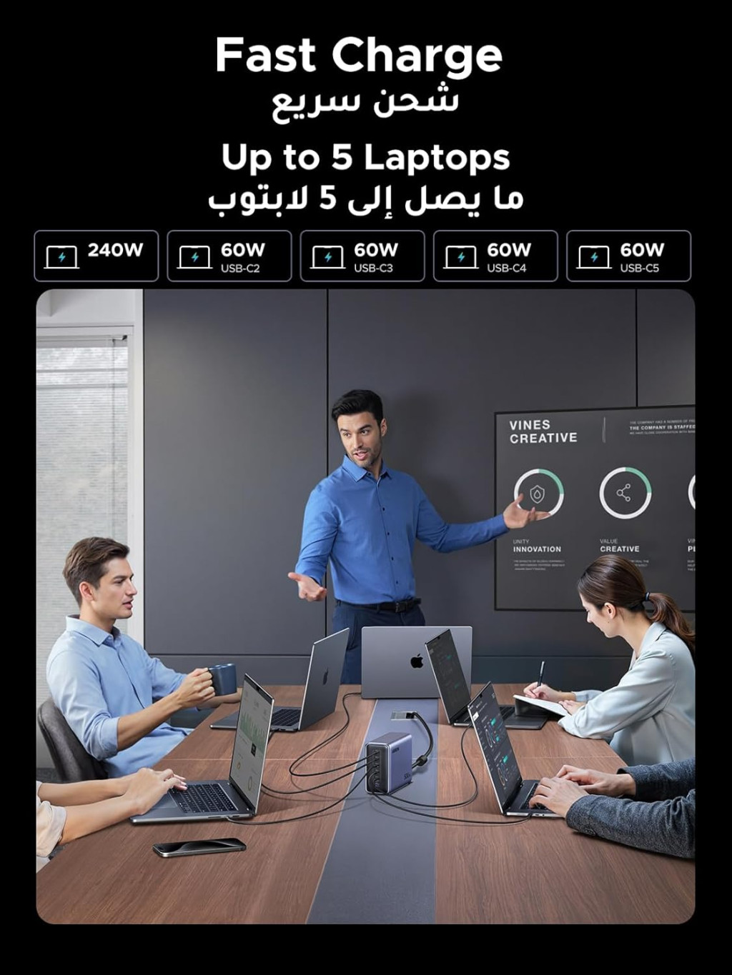 Az UGREEN Nexode X759 egy nagy teljesítményű hálózati töltő, amely akár 500 W összteljesítményű, a legigényesebb felhasználók számára készült. Hat portjával (5× USB-C és 1× USB-A) lehetővé teszi, hogy egyszerre több eszközt töltsön - a laptopoktól és tabletektől kezdve az okostelefonokon és konzolokon át a kiegészítőkig. Tökéletes az irodába, otthonra és utazáshoz. Az 500 wattos teljesítménynek köszönhetően egyszerre több igényes eszközt is biztonságosan és gyorsan tölthetsz. Egyetlen USB-C port akár 240 wattot is elérhet (Power Delivery 3.1), ami azt jelenti, hogy rövid idő alatt számos eszközt tölthetsz fel. Az UGREEN Nexode X759 segítségével könnyedén tölthetsz akár 5 laptopot is egyszerre!