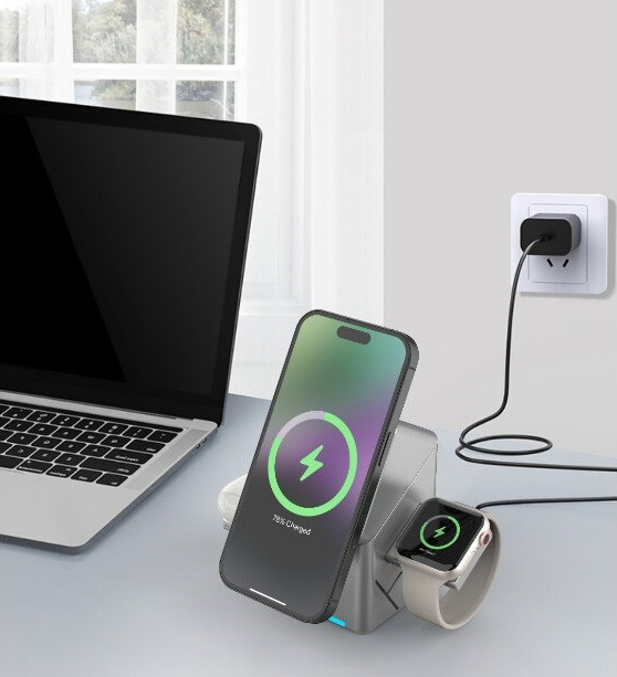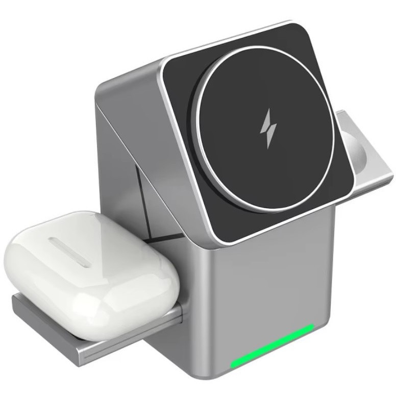 Univerzális vezeték nélküli töltő állomás 3in1, Qi Wireless, 15W, asztali tartó, mágneses, forgatható, Magsafe kompatibilis eszközökhöz, Geometric Charger, ezüst