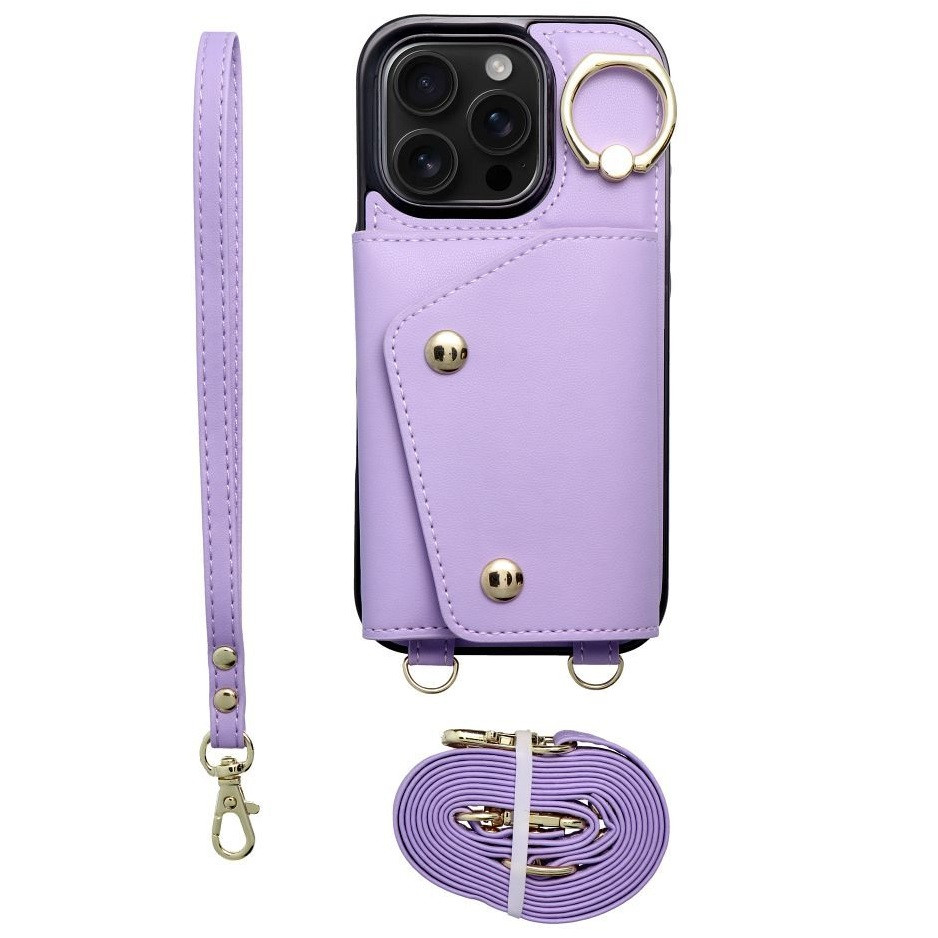 Wonder iPhone 17e / iPhone 16e kártyatartós tok gyűrűs kitámasztóval, csuklóra / vállra akasztható pánttal, lila