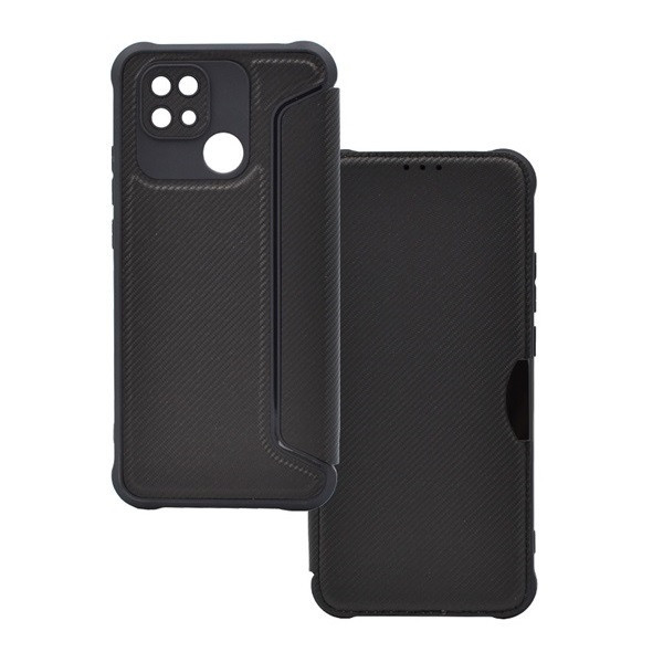 Xiaomi Redmi 10C, Oldalra nyíló tok, légpárnás sarok, bőrhatású, karbon minta, Razor Book, fekete