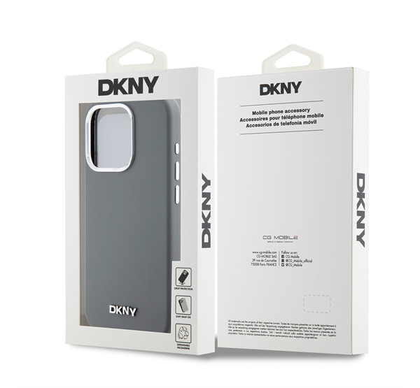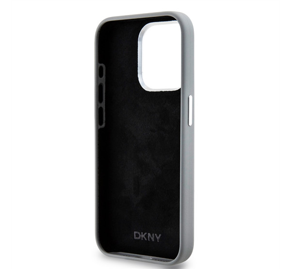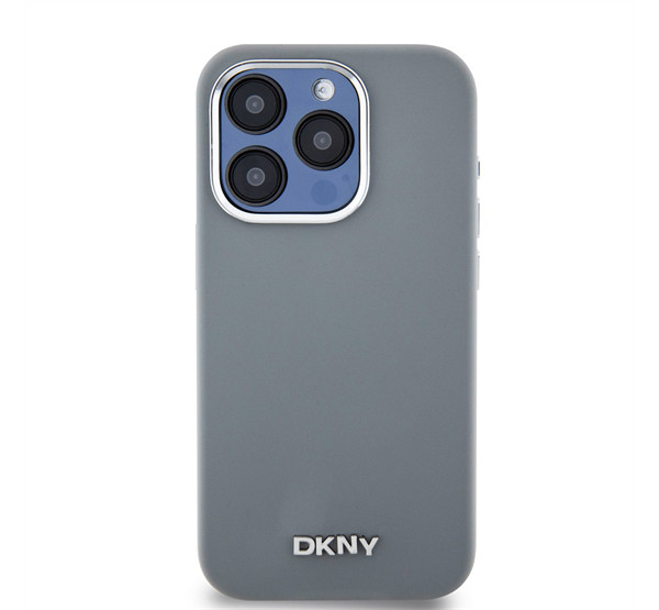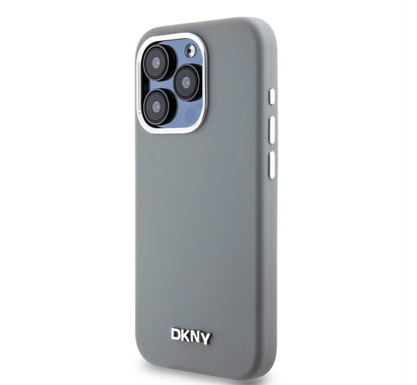 DKNY Liquid Silicone Silver Metal Logo Magsafe iPhone 15 Pro hátlap tok, szürke
