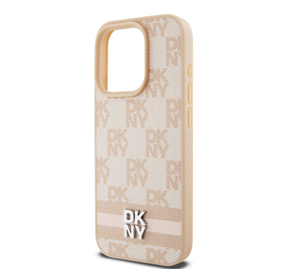 DKNY PU Leather Checkered Pattern and Stripe iPhone 14 Pro hátlap tok, rózsaszín
