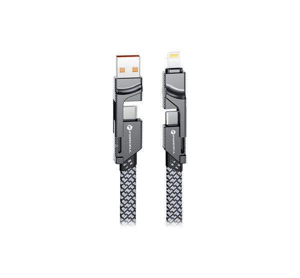 A Forcell 4 az 1-ben kábel modern és sokoldalú megoldás mindazok számára, akik értékelik a kényelmet és a sokoldalúságot. A cserélhető USB-C + USB-A és USB-C + Lightning csatlakozókkal felszerelt kábel sokféle eszköz gyors töltésére nyújt lehetőséget. Fejlett kialakításának és robusztus anyagainak köszönhetően a kábel minden körülmények között teljesít, hosszú távú és megbízható szolgáltatást nyújtva.