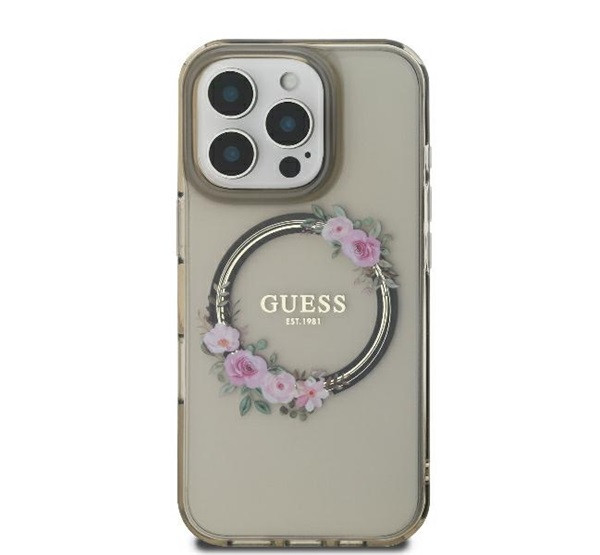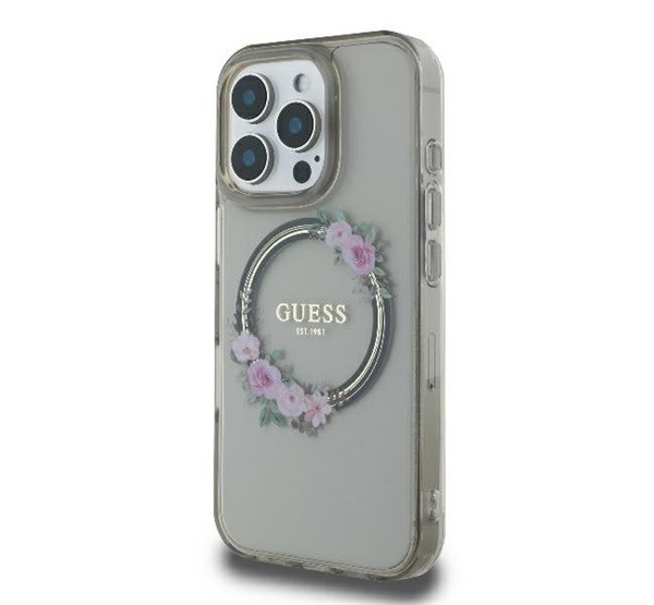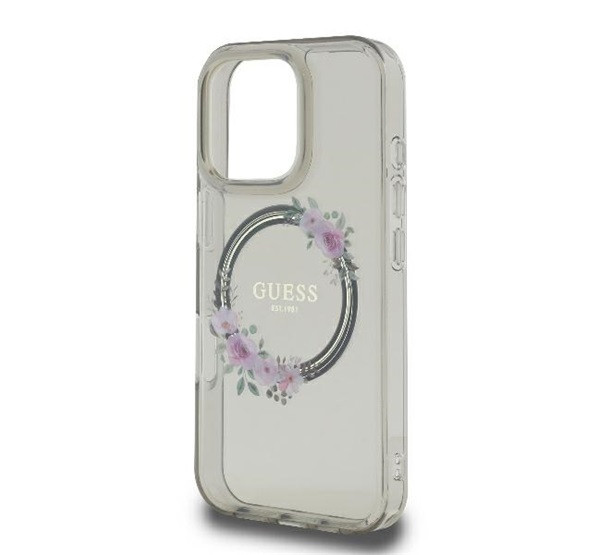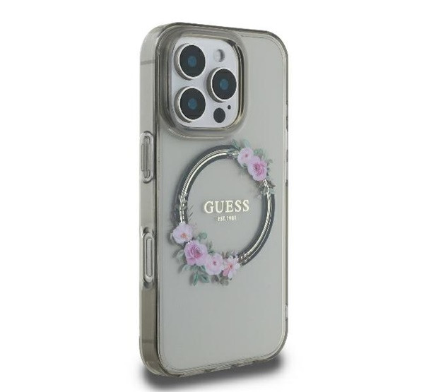 Guess IML Flowers Wreath iPhone 16 Pro MagSafe kemény hátlap tok, fekete GUHMP16LHFWFCK
