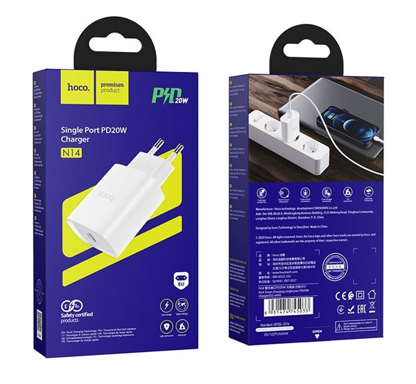 A Hoco N14 hálózati töltő adapter egy kompakt és erőteljes eszköz, amely támogatja a 20W-os Type-C PD (Power Delivery) gyorstöltést. A töltő fehér színben érhető el, és EU csatlakozóval rendelkezik, így kompatibilis az európai szabványokkal. Az adapter PC lángálló anyagból készült, amely biztosítja a biztonságos és megbízható használatot. Mérete 824023mm, súlya pedig mindössze 50g, ami rendkívül könnyűvé és hordozhatóvá teszi.