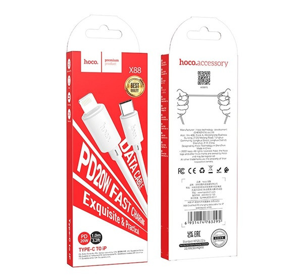 A Hoco X88 Gratified Type-C / Lightning töltő- és adatkábel egy 1 méter hosszú kábel, amely 20W teljesítményű gyorstöltést biztosít Power Delivery (PD) és Quick Charge (QC) támogatással. Kifejezetten olyan eszközökhöz készült, amelyek Lightning és Type-C csatlakozókkal rendelkeznek. A kábel strapabíró fém csatlakozókkal van ellátva, és maximális töltési áramerőssége 2400mA. Ezen kívül adatátvitelre is alkalmas, akár 480 Mbps sebességgel. Ideális választás mindennapi használatra, különösen iPhone és más Apple eszközök gyors töltésére