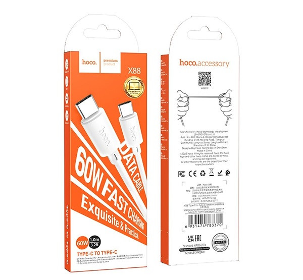 A Hoco X88 Gratified Type-C to Type-C töltő- és adatkábel 60W teljesítményű gyorstöltést biztosít, így alkalmas laptopok, táblagépek és okostelefonok töltésére is. A kábel hossza 1 méter, és PVC burkolattal rendelkezik, amely tartóssá és ellenállóvá teszi a mindennapi használat során. Támogatja a Power Delivery (PD) technológiát, ami hatékony energiaátvitelt tesz lehetővé, akár 60W-ig (20V/3A). Ez ideális választás, ha nagyobb eszközöket, például laptopokat szeretne tölteni​