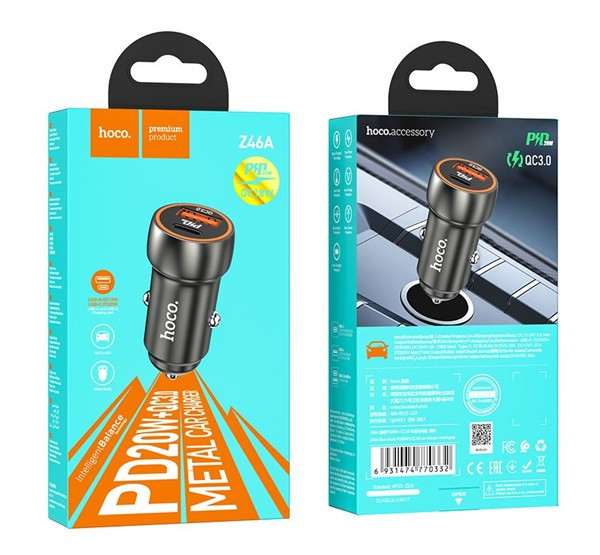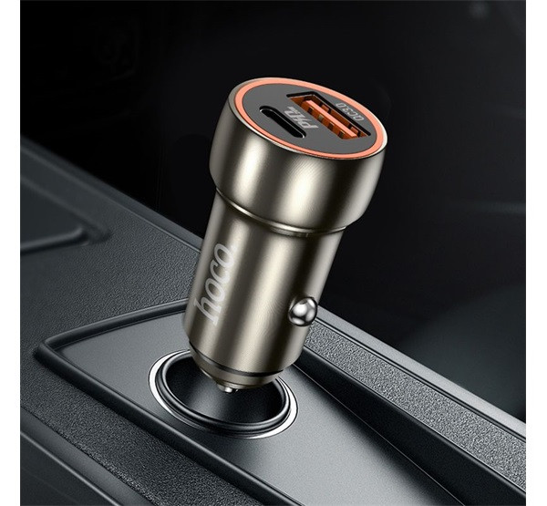 Hoco Z46A autós szivargyújtó töltő, USB-C + USB-A QC3.0, 20W, metálszürke