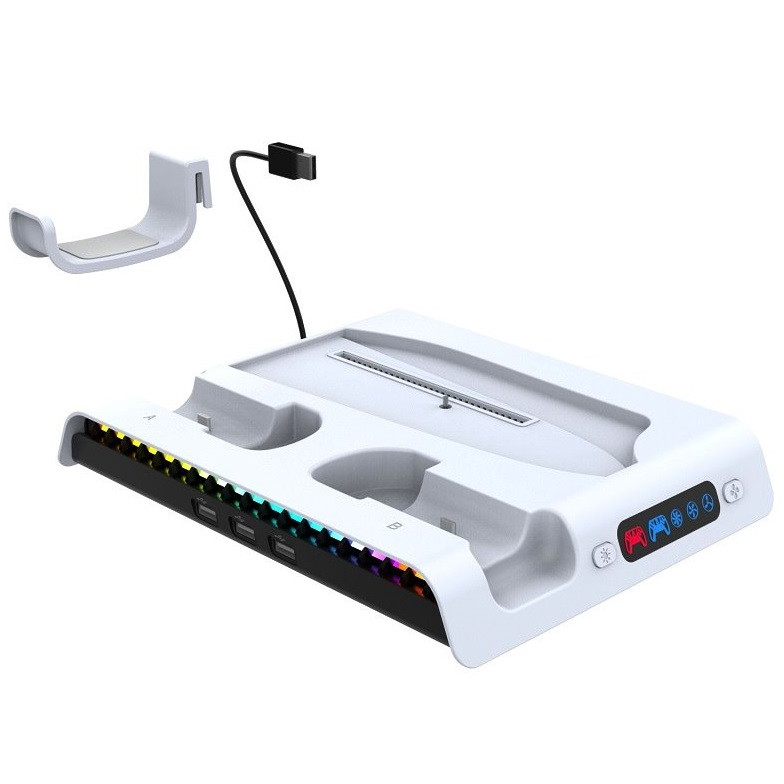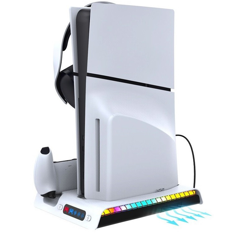iPega P5S006 Multifunkcionális töltőállvány, amelyet a Playstation 5 Slimhez terveztek. Praktikus állvány beépített ventilátorokkal a konzolhoz, a legjobb hűtés érdekében hosszú órákon át tartó játék közben. Az állvány két kontroller töltővel, praktikus fejhallgató-tartóval, három USB-porttal és RGB háttérvilágítással is rendelkezik.