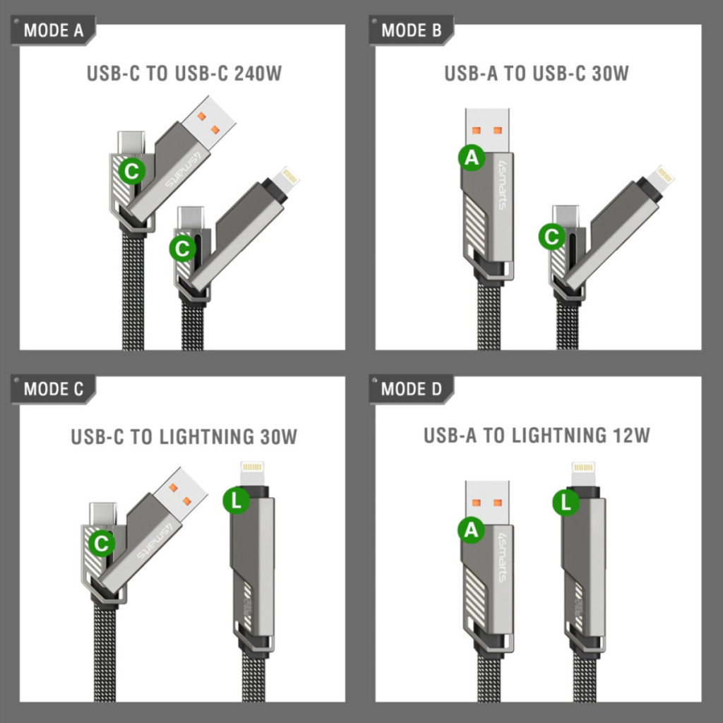 4smarts ComboCord USB-C / USB-C / USB-A töltő és adatkábel, 240W, 1,5m, kulcstartó kábellel, szürke
