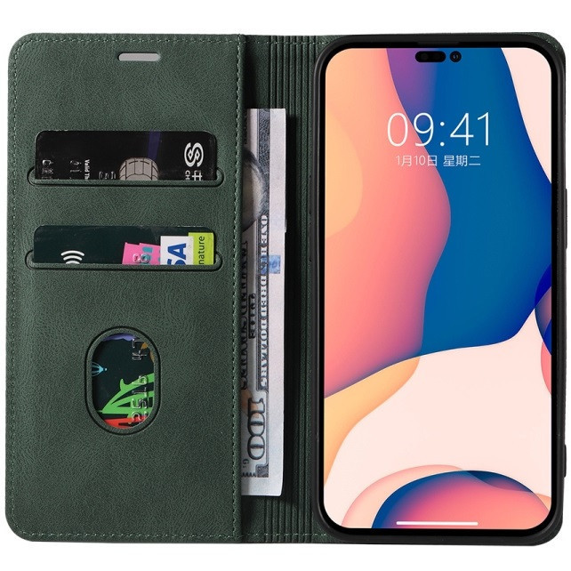 Apple iPhone 14 Pro Max, Oldalra nyíló tok, stand, kártyatartóval, kézpánttal, Wooze Business Plus, sötétzöld