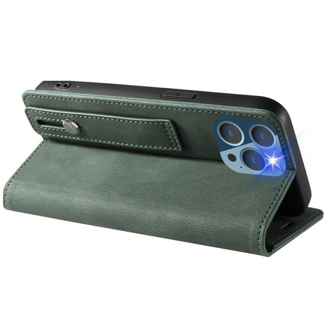Oppo A74 4G / A95 4G / Reno6 Lite, Oldalra nyíló tok, stand, kártyatartóval, kézpánttal, Wooze Business Plus, sötétzöld