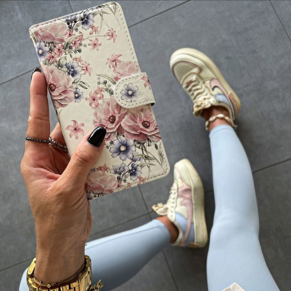 Samsung Galaxy M13 4G SM-M135F, Oldalra nyíló tok, stand, mágnes csattal, virág minta, TP Wallett Blossom Flower, fehér/színes