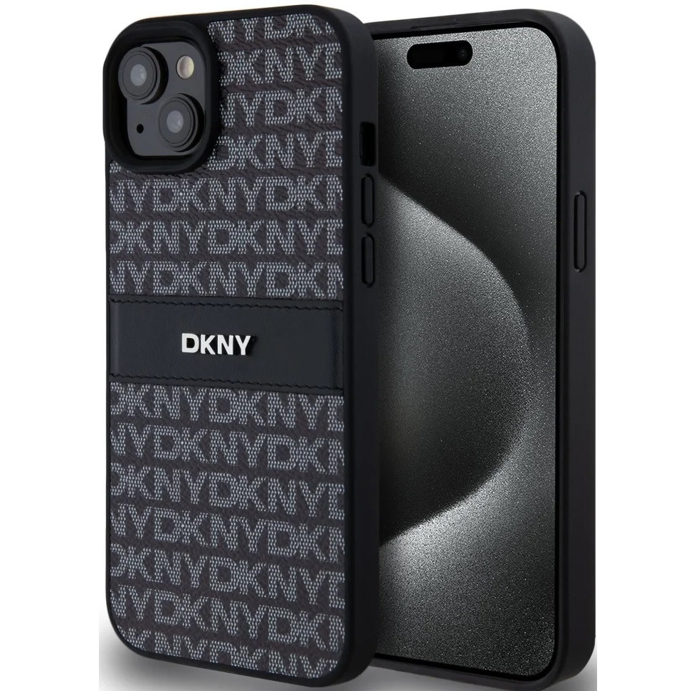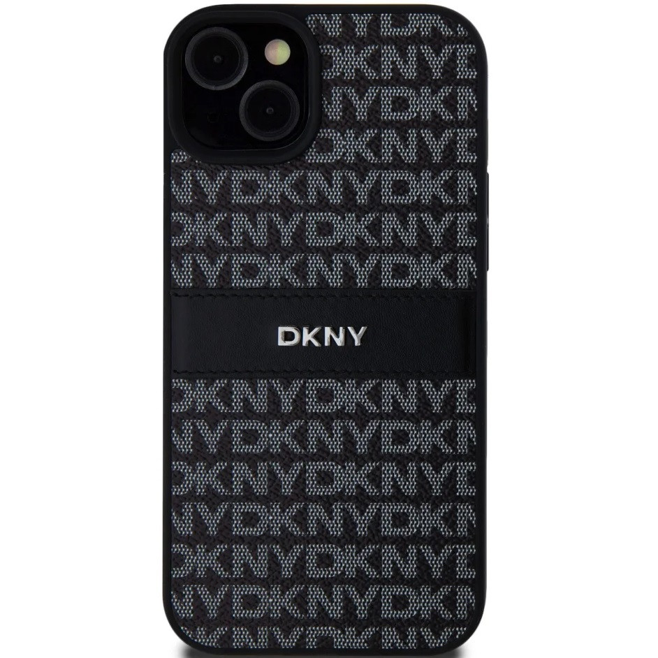 DKNY PU Leather Repeat Pattern Tonal Stripe Apple iPhone 15 Plus hátlap tok, fekete