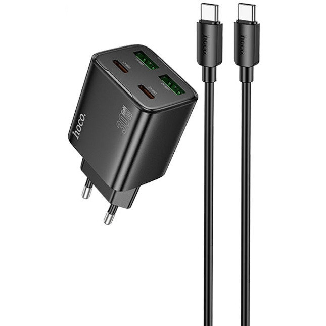 Hálózati töltő adapter, 30W, 2 x USB aljzat, 2 x USB Type-C aljzat, USB Type-C - USB Type-C kábellel, gyorstöltés, PD, GaN, QC 3.0, Hoco N56 Fundador, fekete