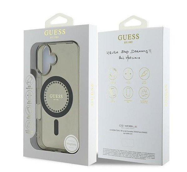 A tok minimalista, mégis elegáns kialakításával tűnik ki, amely ötvözi a modernitást a stílussal. A MagSafe gyűrű tökéletesen illeszkedik a tok színvilágához, megjelenését pedig finoman csillogó strasszkövek fokozzák, amelyek egy kis luxust kölcsönöznek. A dizájnt a GUESS logó teszi teljessé, amelyet stílusosan a gyűrű közepén helyeztek el, hangsúlyozva ennek az egyedi kollekciónak az exkluzivitását. Ez az elegancia és a funkcionalitás tökéletes kombinációja, amely biztosan elbűvöli a kifinomult dizájn szerelmeseit.