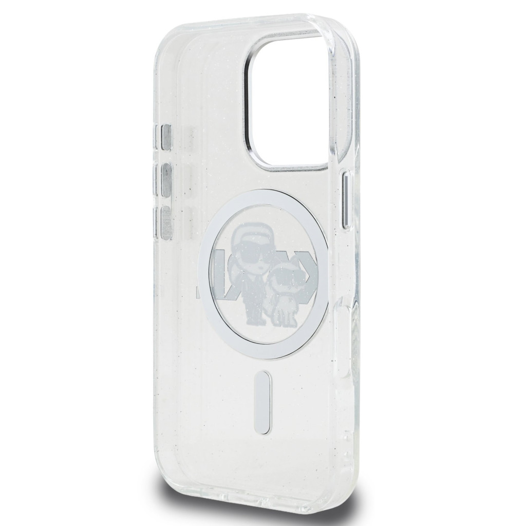Karl Lagerfeld IML Glitter Karl and Choupette Sketch iPhone 16 Pro Max MagSafe kompatibilis hátlap tok, átlátszó