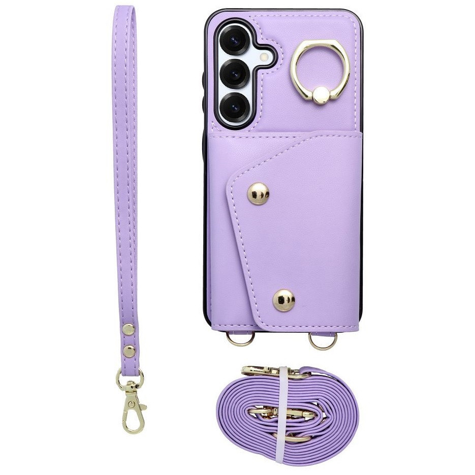 Wonder Samsung Galaxy S25 kártyatartós tok gyűrűs kitámasztóval, csuklóra / vállra akasztható pánttal, lila