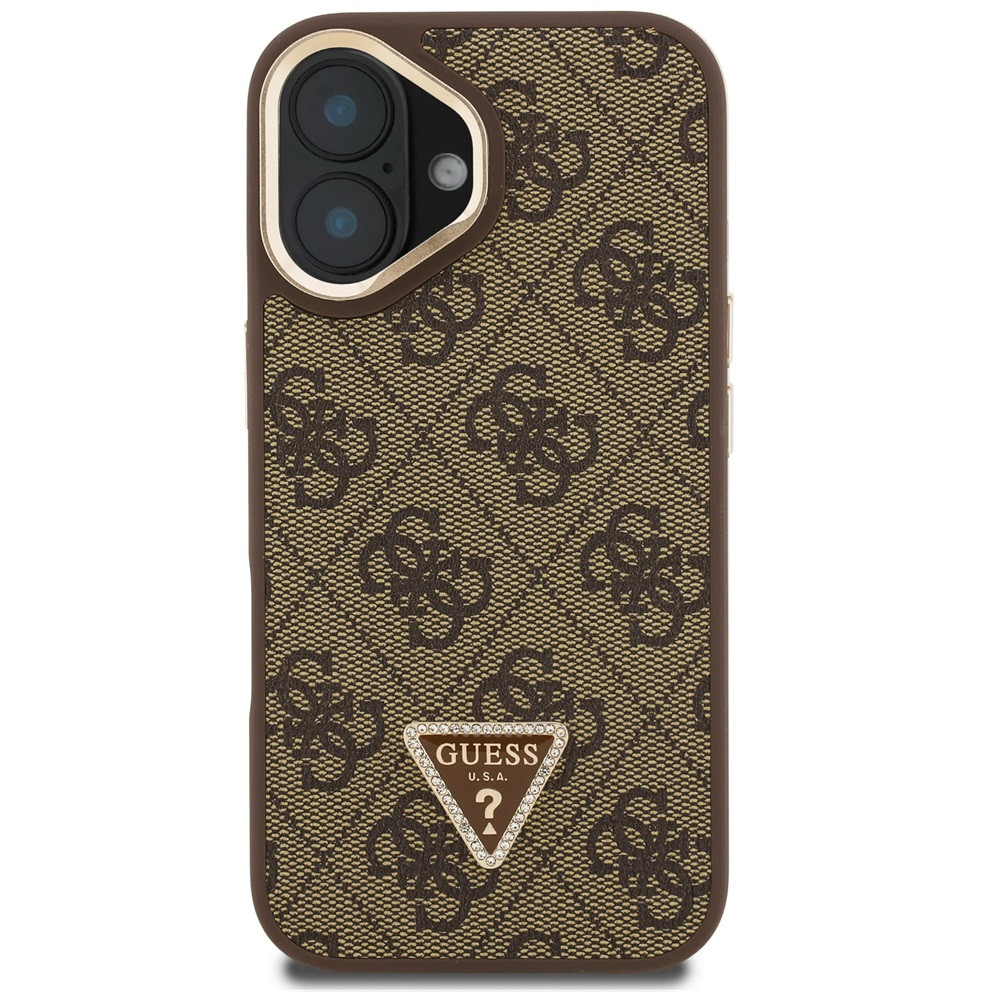 Guess PU 4G Strass Triangle Logo Apple iPhone 16 MagSafe tok kitámasztható kamera peremmel, barna-arany