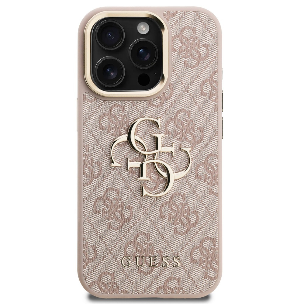 Guess PU 4G Metal Logo Apple iPhone 16 Pro hátlap tok kitámasztható kamera peremmel, rózsaszín-arany