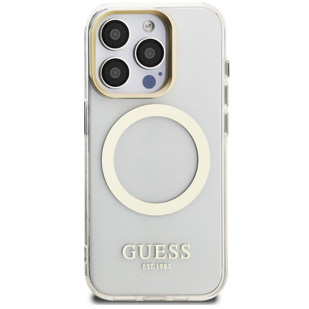 Guess IML Gold Outline Stand Camera Frame iPhone 15 Pro Max MagSafe hátlap tok kitámasztóval, átlátszó-arany