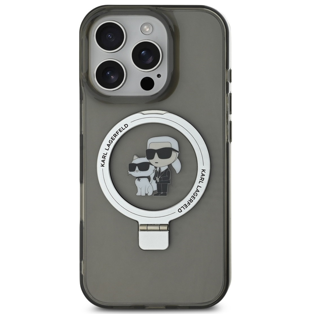 Karl Lagerfeld Ringstand Karl and Choupette iPhone 16 Pro MagSafe tok kitámasztóval, fekete