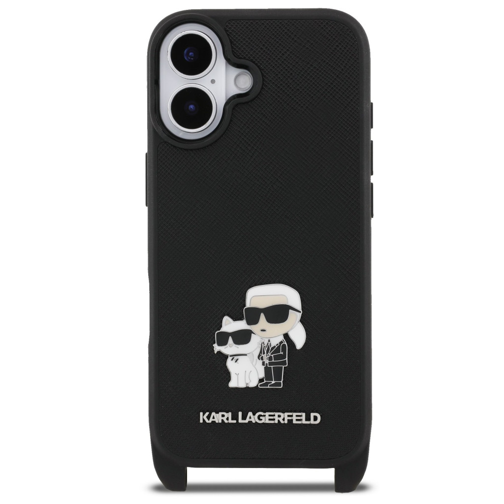 Karl Lagerfeld Saffiano Crossbody Strap Metal Karl and Choupette Apple iPhone 17 hátlap tok pánttal, fekete