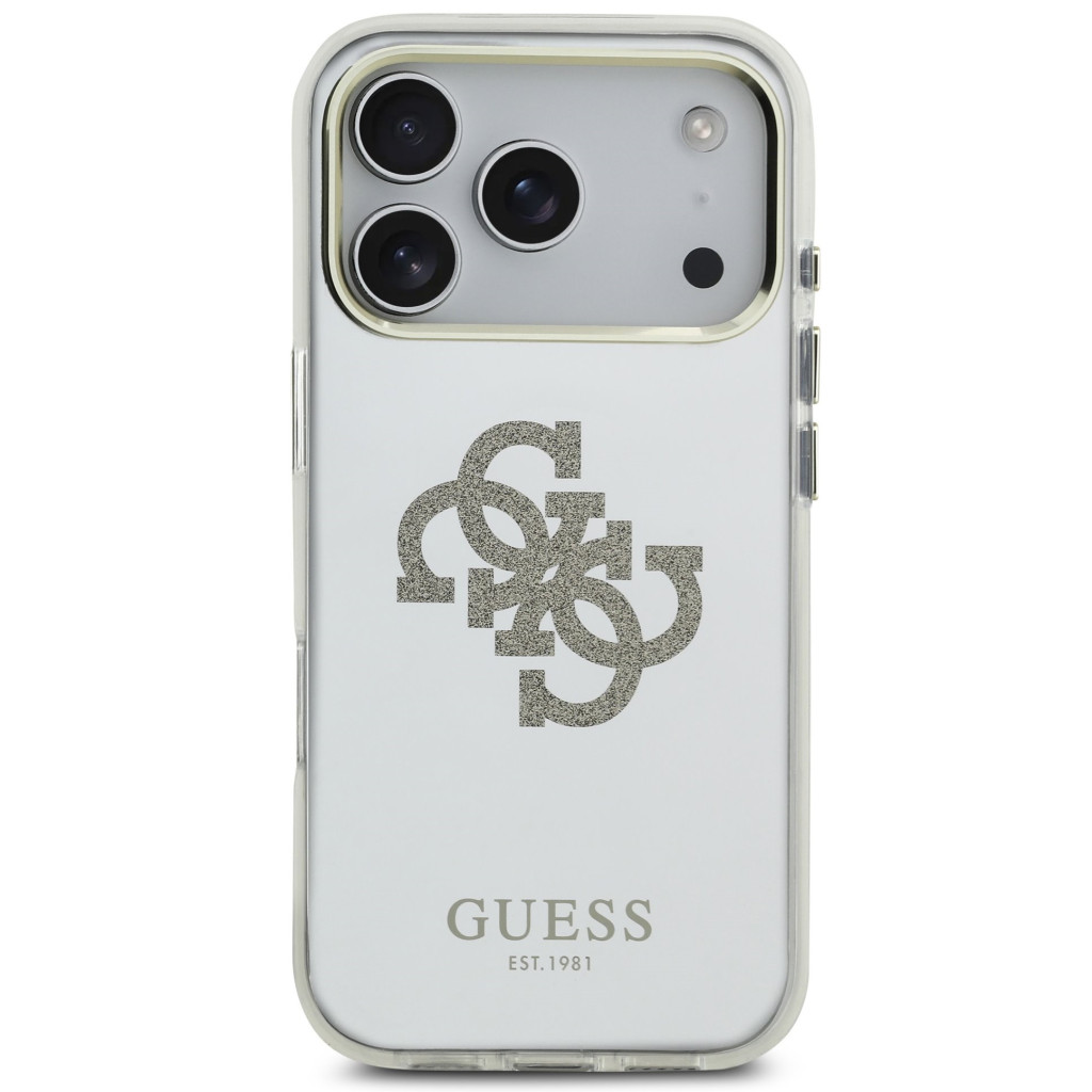 Guess PC/TPU Mirror 4G Glitter Logo Apple iPhone 17 Pro Max csillámos hátlap tok kameravédő peremmel, MagSafe, arany