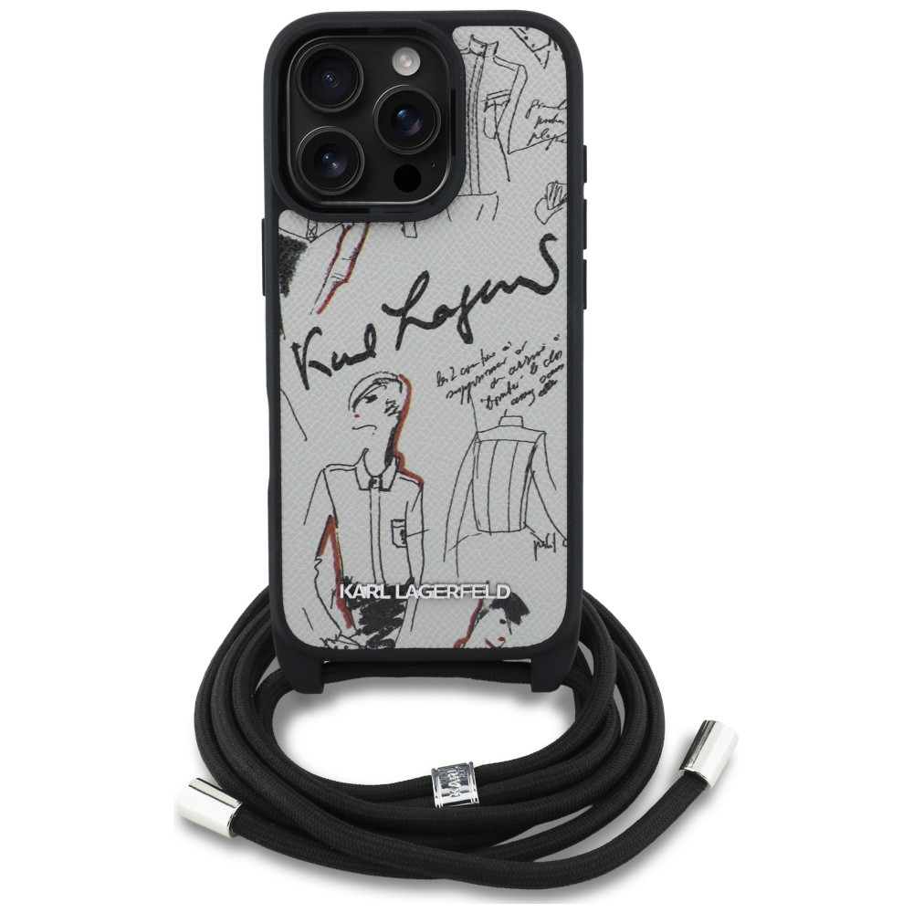 Karl Lagerfeld Crossbody Grained Pattern & Logo iPhone 16 Pro Max műbőr hátlap tok vállpánttal, MagSafe, szürke