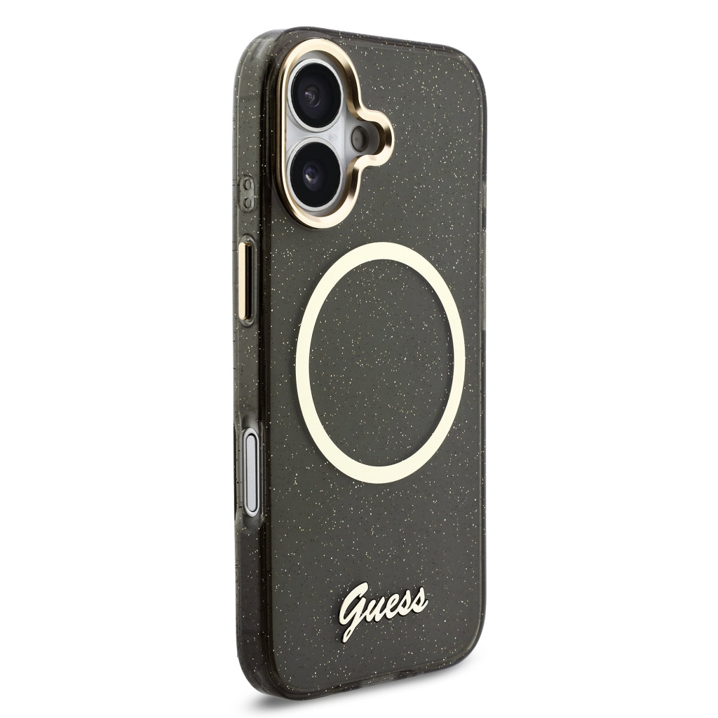 Guess IML Glitter Script Strap Apple iPhone 17 csillámos hátlap tok karpánttal, MagSafe, fekete-arany