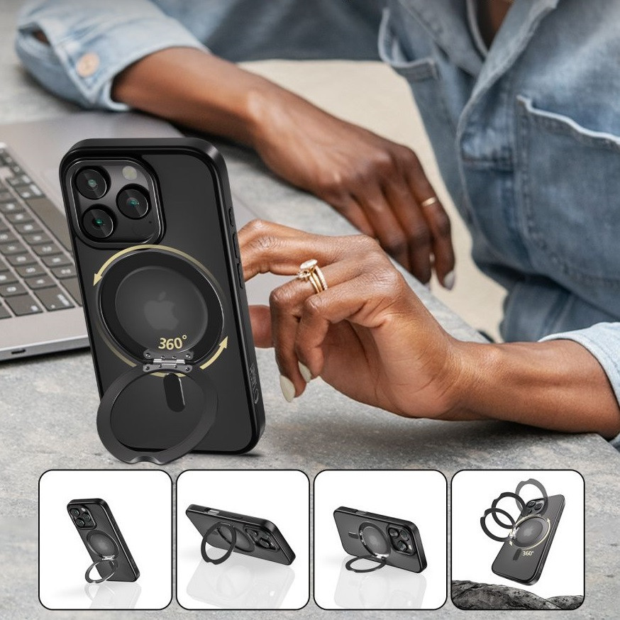 Apple iPhone 17 Pro, Műanyag hátlap védőtok + szilikon keret, kitámasztóval, ujjtámasz, Magsafe töltővel kompatibilis, Magring Magsafe, áttetsző/fekete