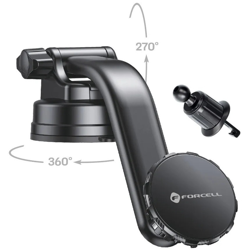 Autós tartó, univerzális, szélvédőre vagy szellőzőre vagy műszerfalra rögzíthető, 360°-ban forgatható, mágneses, Forcell F-Grip MagLuxe, fekete