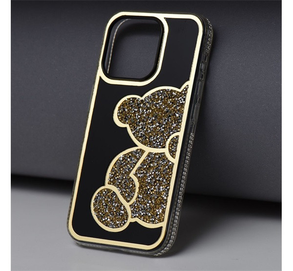 Teddy Bear iPhone 15 Pro csillogó köves tok, arany