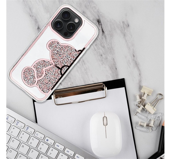 A Teddy Bear egy stílusos és funkcionális tok, amely jellegzetes, csillogó mackómintával, emelt élekkel rendelkezik. Műanyagból készült.
